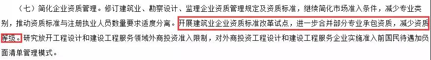 《2018年工作要點》中明確表示:繼續(xù)簡化市場準入條件,減少專業(yè)類別;開展建筑業(yè)企業(yè)資質(zhì)標準改革試點,進一步合并部分專業(yè)承包資質(zhì),減少資質(zhì)等級。